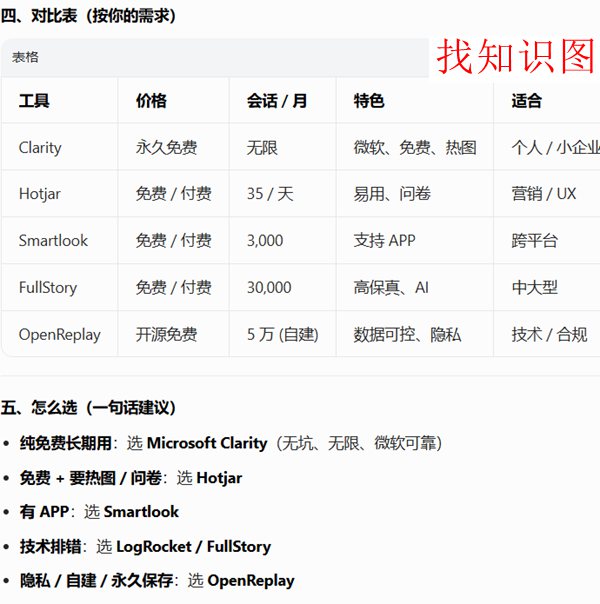 主流 Session Replay 工具可分为永久免费、付费 SaaS、开源自建三类,下面按实用性和性价比整理: